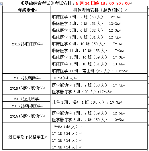 2016级临床医学、麻醉学、医学影像学、儿科学、精神医学专业、2015级医学影像学专业《基础综合考试》及过往学期此门课程不及格学生考试安排在2018年9月14日晚18:00-20:00在越秀校区进行。