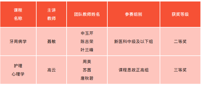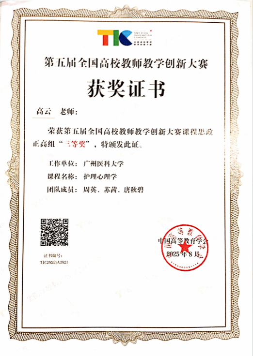 8月16日至19日,由教育部高等教育司指导、中国高等教育学会主办的第五届全国高校教师教学创新大赛在北京理工大学举办。我校代表广东赛区参赛的两个教师团队再获佳绩,口腔医学院聂敏老师团队荣获新医科赛道中级及以下组二等奖,护理学院高云教授团队荣获课程思政赛道正高组三等奖。