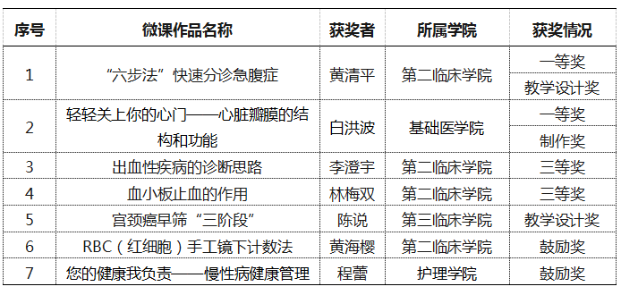 此次比赛旨在促进促进课程教师专业发展和教学能力提升,顺应信息技术与教育教学深度融合的趋势,推动教学模式改革和教学质量持续提高,共有来自全国25个省(市、自治区)的93所高校提交了835件作品。经过赛事组委会评审,我校第二临床学院黄清平老师,基础医学院白洪波老师微课参赛作品脱颖而出荣获一等奖,这是学校组织参加该项赛事以来取得的最佳成绩。
