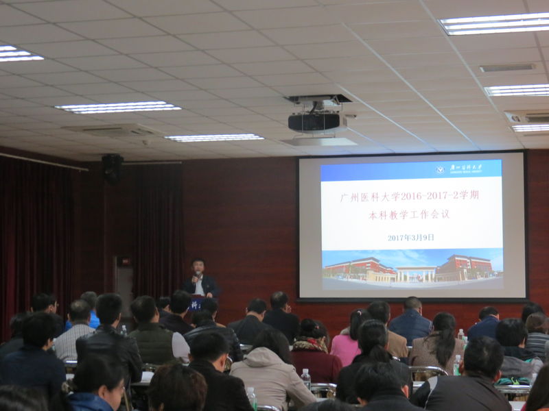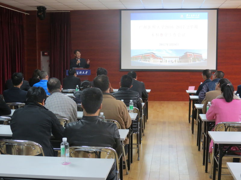 3月9日,学校在番禺校区教师教学发展中心召开了2016-2017-2学期本科教学工作会议。会议由罗健东副校长主持,王新华校长、教务处、人事处、学生处、团委等部门负责人出席了会议,各学院、直属附属医院、2016-2017学年有承担教学任务的非直属附属医院主管教学副院长、教学科/科研科科长、专业负责人,市皮防所、实验动物中心、学生处、图书馆、保卫处等所承担授课任务的课程负责人等,共约90人参加了会议。