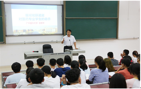 校长王新华教授以“屠呦呦获诺奖对医药专业学生的启示”为题,与同学畅谈医学生的使命担当,并就相关问题与同学们进行互动。王新华校长介绍了屠呦呦以及全国协作研发团队对青蒿素创制的贡献,指出人类与病原微生物的较量永远在路上,需要我们一代又一代人努力地深入科研、掌握规律。要秉持科学态度和奉献精神,执着、坚持地做研究工作。医学生身上肩负人类健康与生命保障的重担,同学们需要有使命感。